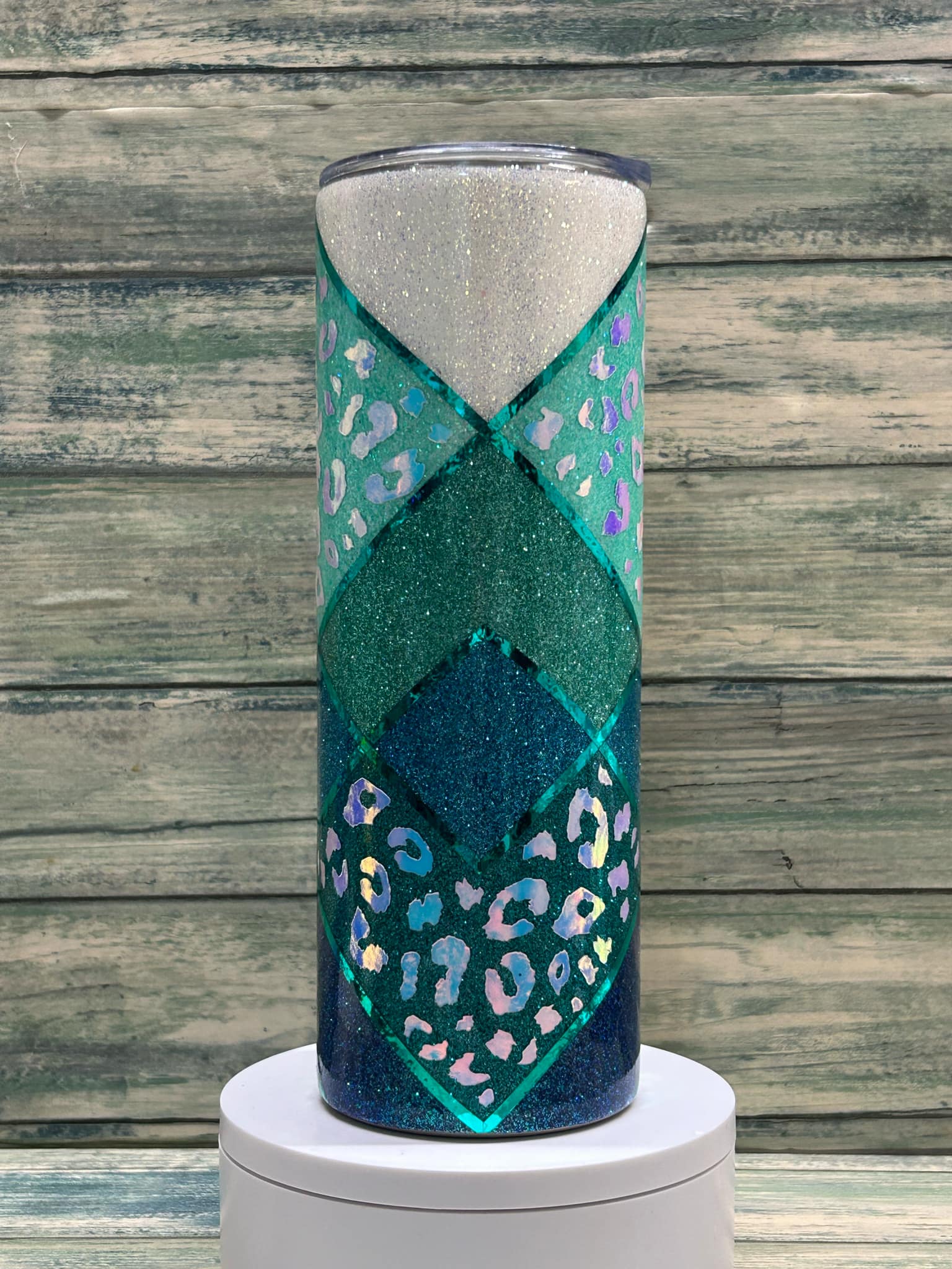 Expertly crafted with durable stainless steel, the Beautiful Emerald tumbler boasts a striking glow-in-the-dark geometric pattern in shades of green, accented with a fierce leopard print. This 20oz tumbler not only keeps your drinks at the perfect temperature, but also adds a touch of style to your everyday routine.
